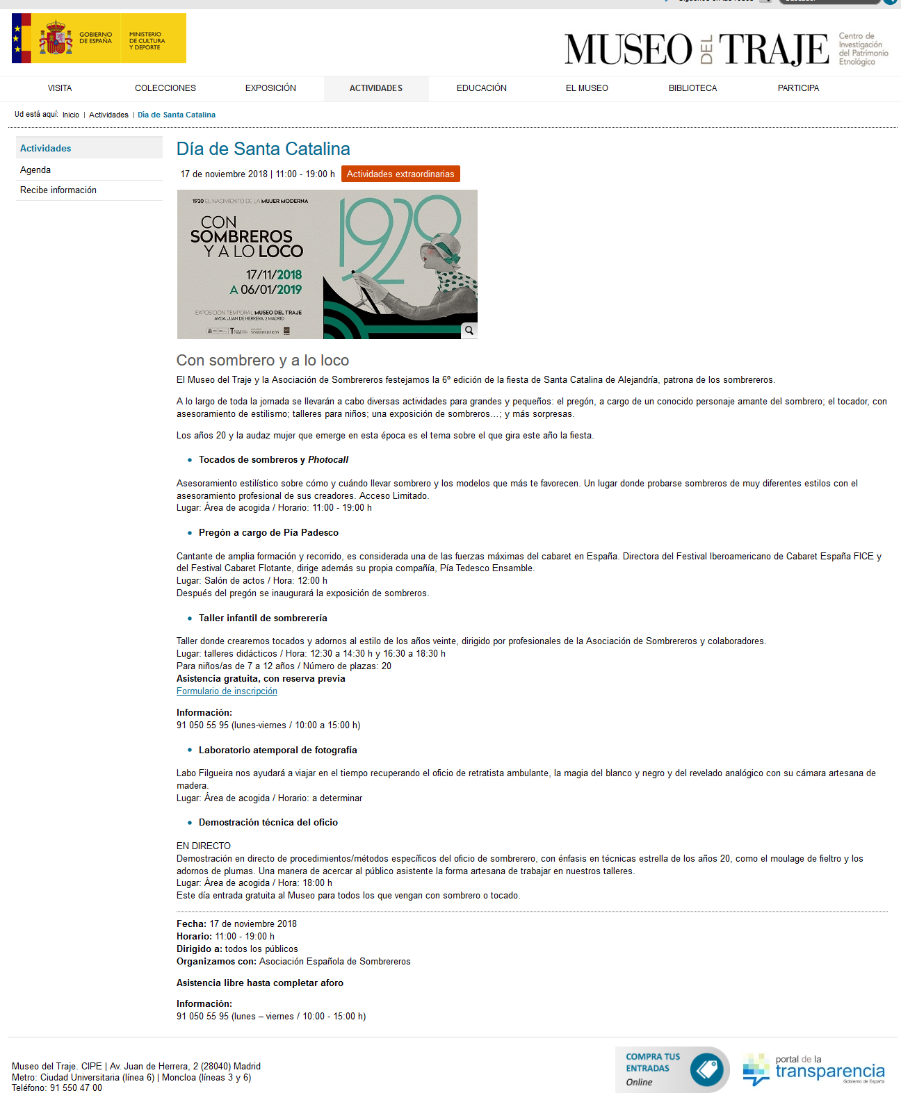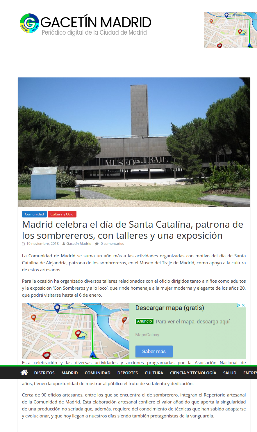El 17 de Noviembre de 2018, como eje central de las actividades organizadas por la ASOCIACION con motivo de la celebración de SANTA CATALINA, se inauguro una maravillosa Exposición en el MUSEO DEL TRAJE de Madrid, como viene siendo habitual en los ultimo años.
